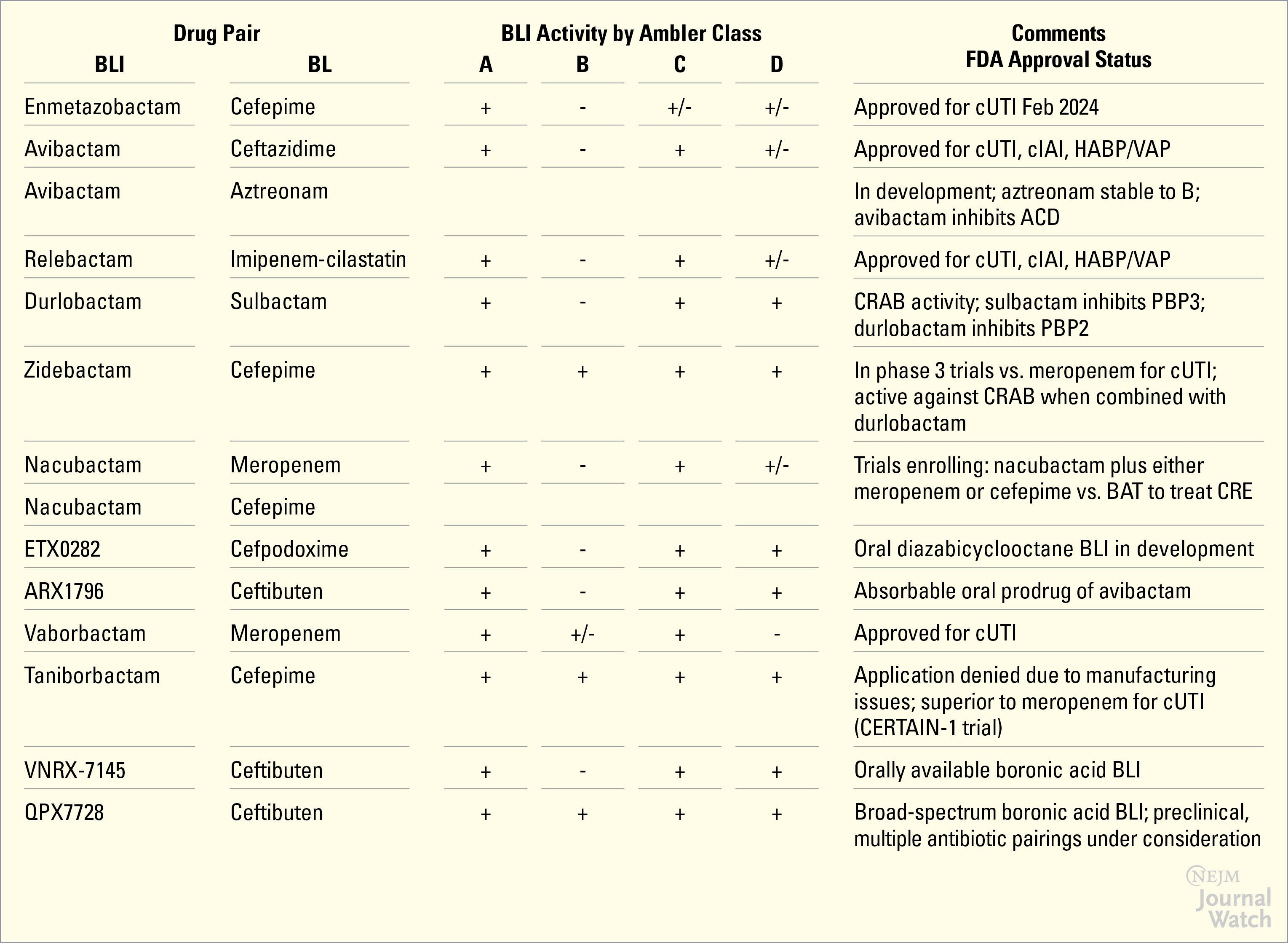 Classical beta-lactamase inhibitors (BLIs) such as sulbactam, clavulanic acid, and tazobactam were initially paired with BLs such as ampicillin, amoxicillin, or piperacillin. More recently, tazobactam has been paired with a novel cephalosporin, ceftolozane (Zerbaxa; approved for the treatment of complicated urinary tract infection [cUTI], complicated intra-abdominal infection [cIAI] when combined with metronidazole, …